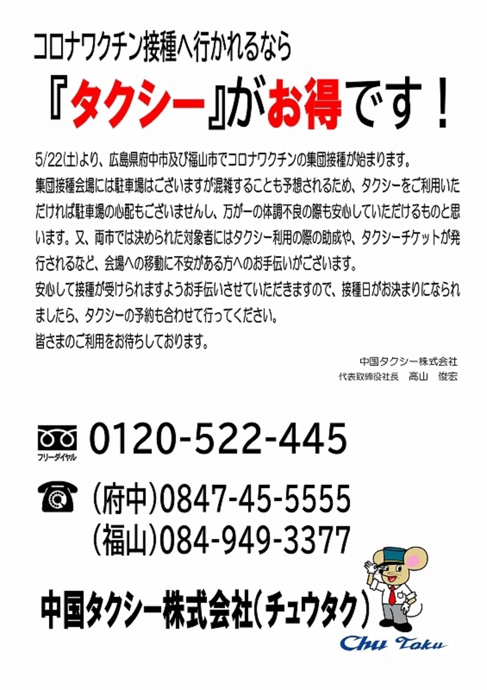接種日が決まられましたら、タクシーの予約を合わせて行ってください。どうぞよろしくお願いいたします。